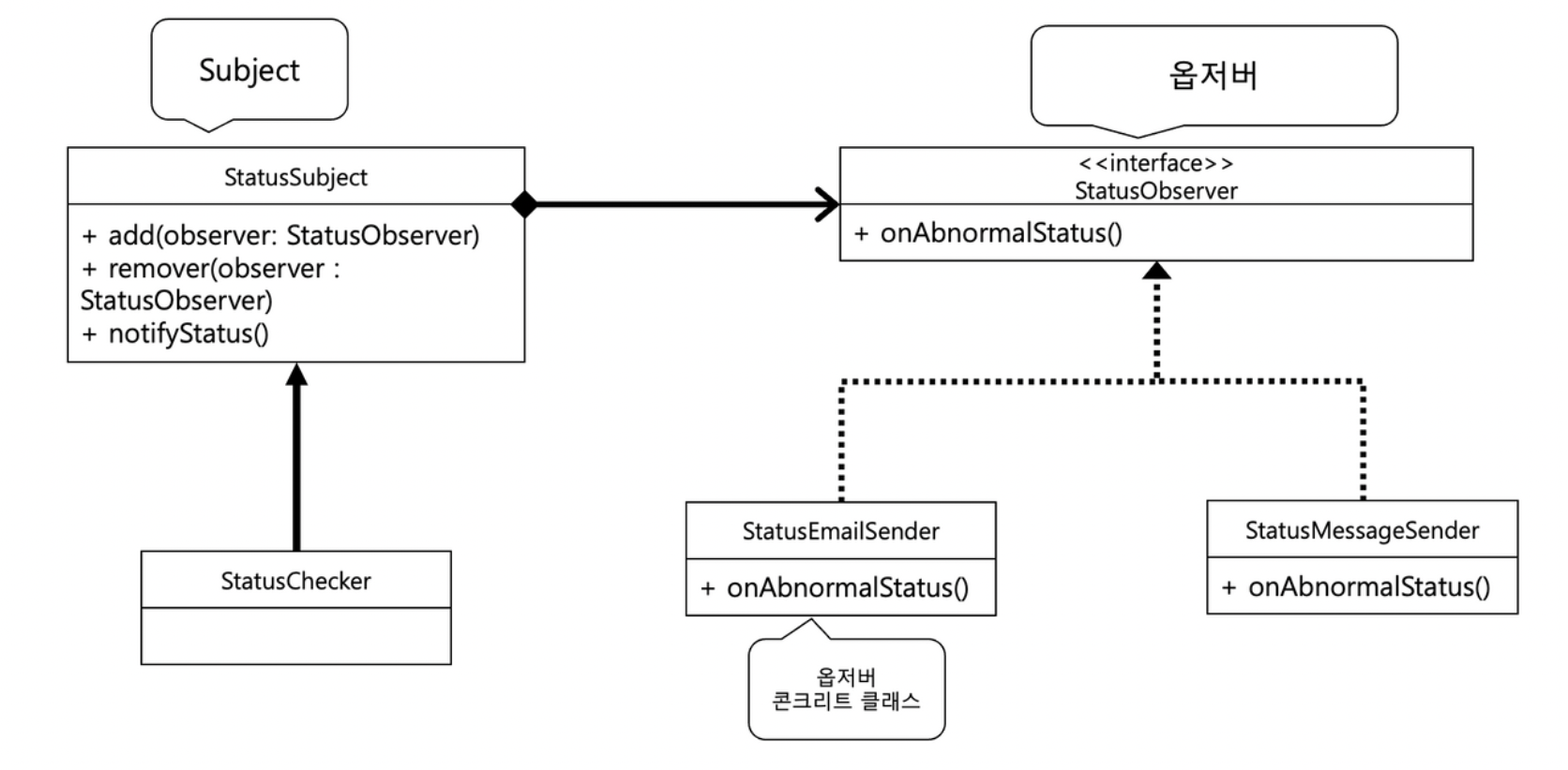 앞 예제의 경우, StatusSubject 타입 객체에 등록되는 옵저버 인터페이스인 StatusObserver는 다음 코드와 같이 Subject 객체로부터 상태 변화를 전달받을 수 있는 메서드인 onAbnormalStatus() 메서드를 정의하고 있다.