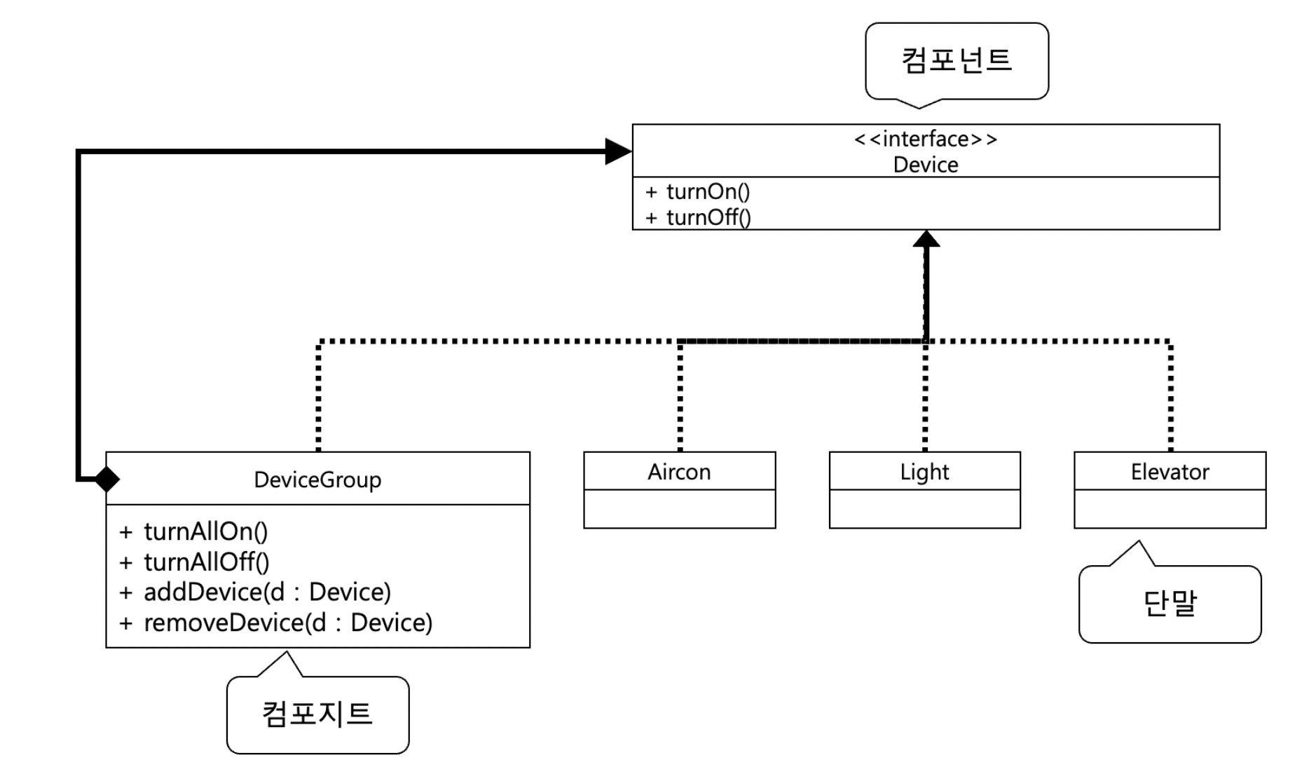 여기서 DeviceGroup 클래스는 개별 Device를 하나의 그룹으로 묶어주는데, Aircon 클래스나 Light 클래스처럼 DeviceGroup 클래스도 Device 인터페이스를 상속받는 것을 알 수 있다.