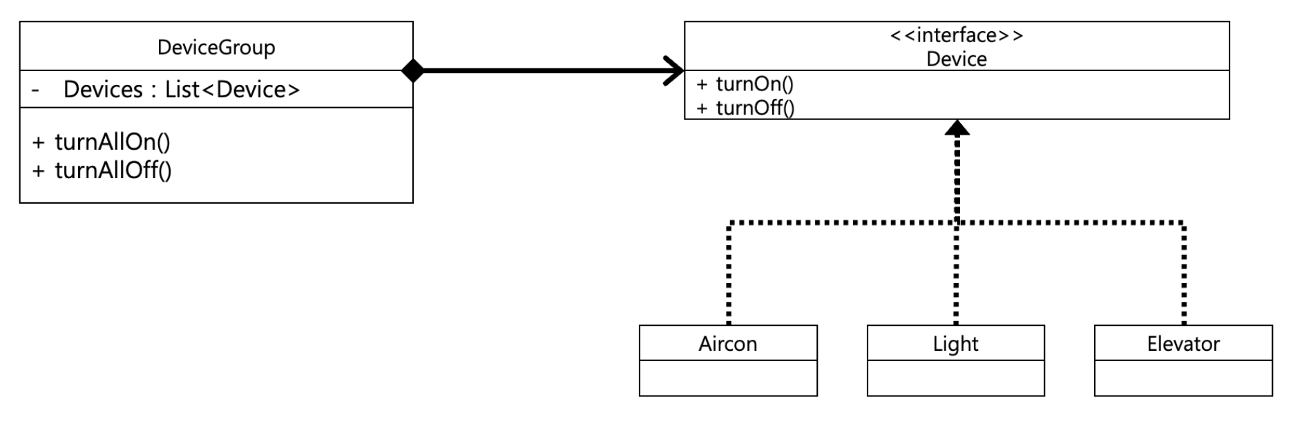 이는, 아래 코드처럼 DeviceGroup 객체에 Device 객체를 등록한 뒤에 DeviceGroup 객체의 turnOn()을 호출하면, 등록되어 있는 모든 Device 객체의 turnOn()이 호출된다는 것을 뜻한다.