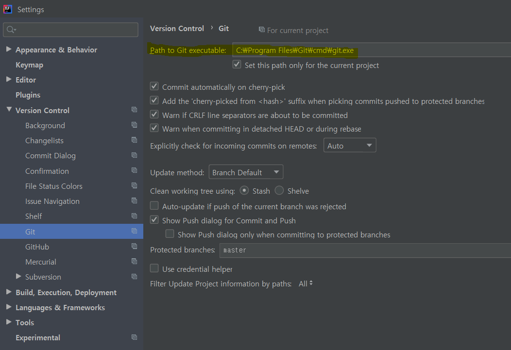 - Path : [File]-[Settings]-[Version Control 탭]-[Git]- Path to Git executable에서 경로를 설정해줘야 한다.