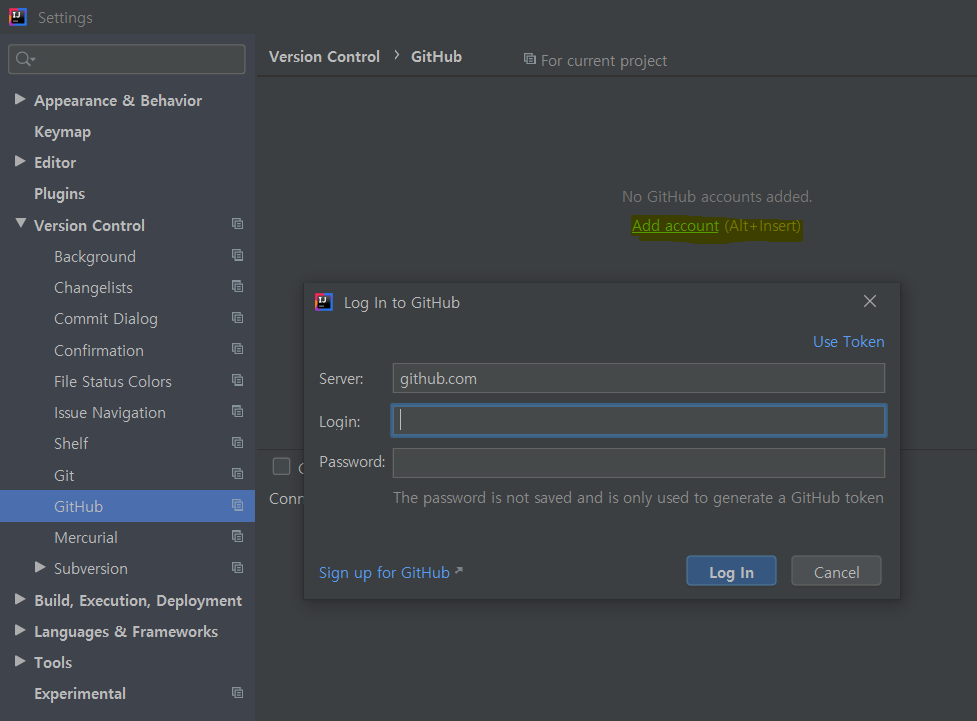 - Path : [File]-[Settings]-[Version Control 탭]-[GitHub]- add account를 누르자.