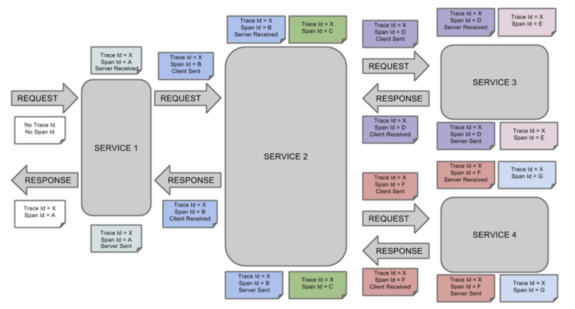 다음 그림은 시스템에서 Span 및 Trace와 Zipkin annotation을 보여준다.