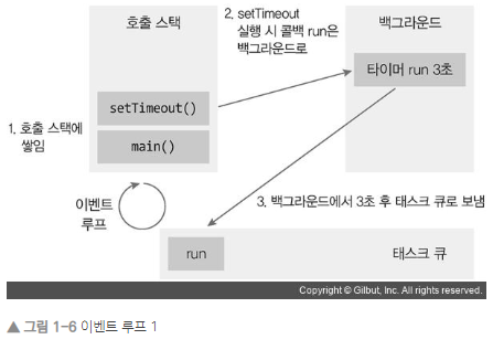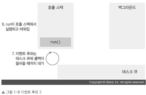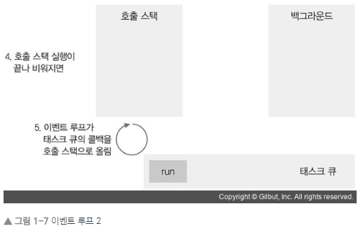 - 백그라운드 : 타이머나 I/O 작업 콜백 또는 이벤트 리스너들이 대기하는 곳입니다.