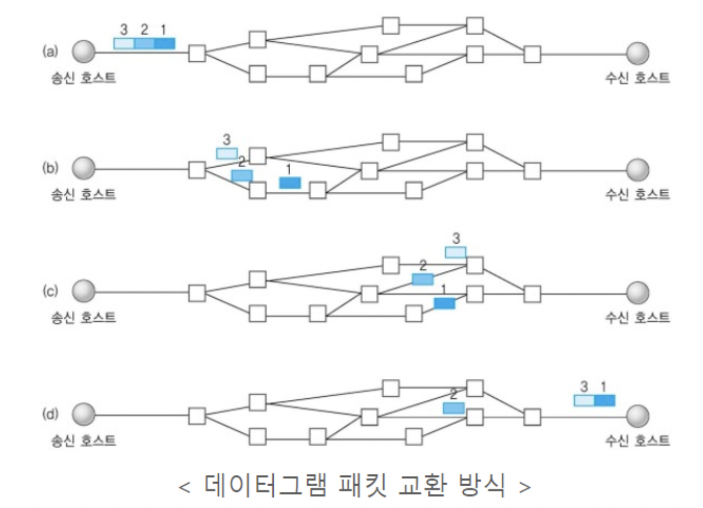 각각의 패킷은 다른 경로로 전송되고, 각각의 패킷은 독립적인 관계를 지니게 된다.