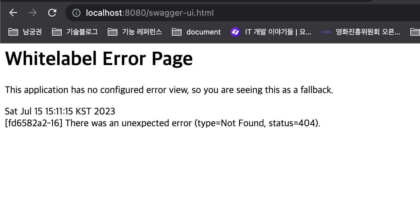 그 뒤 swagger-ui 페이지를 들어가봤는데 404 에러가 발생했습니다.