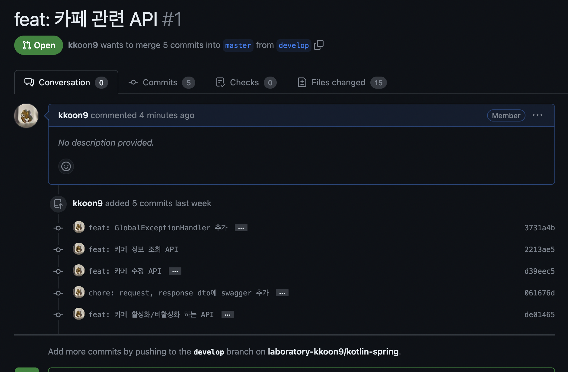 develop 브랜치에 있는 5개의 커밋이 master 브랜치에서 보면 1개의 커밋으로 바뀌어져 있습니다.