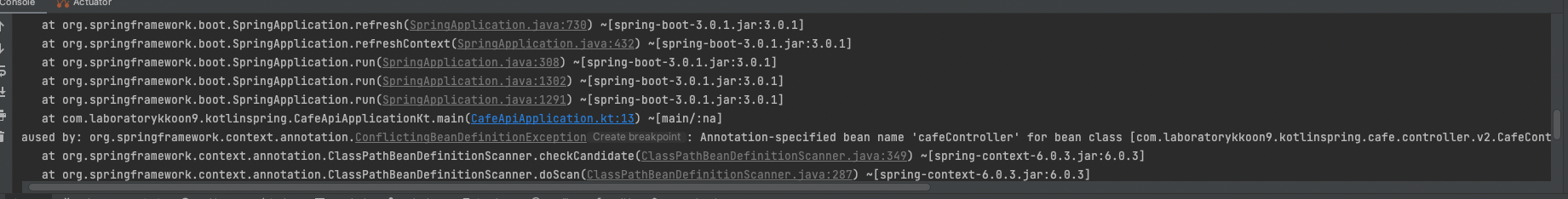 그렇기 때문에 cafeController라는 BeanName이 충돌한 것이죠.