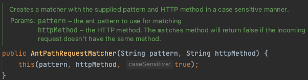 AntPathRequestMatcher는 API path(pattern)와 httpMethod를 포함하는 matcher입니다.